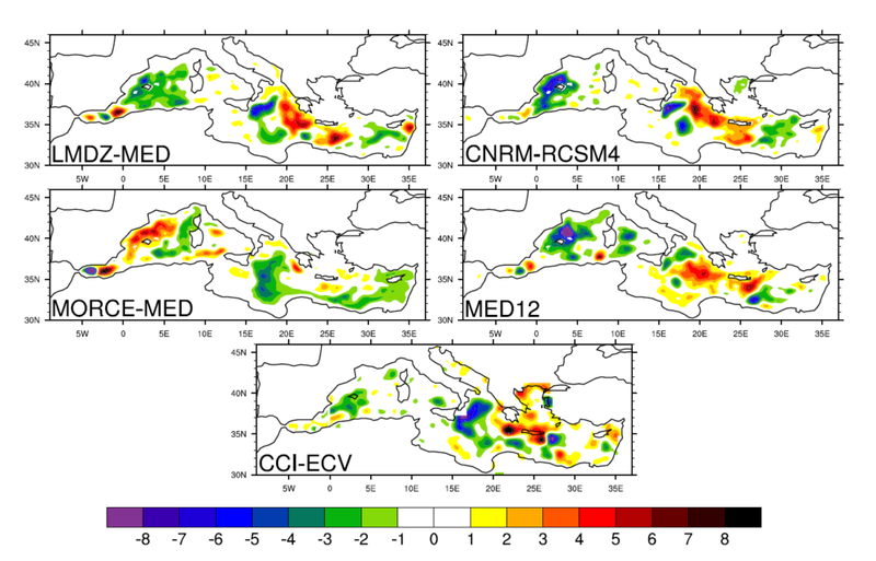 Météo France has extended the confrontation of models with CCI Sea Level data over the Mediterranean area to include the analysis of three coupled regional simulations (CNRM-RCSM, LMDZ-MED, MORCE-MED) and one Mediterranean Sea simulation (MED12) from the Med-Cordex multi-model ensemble.