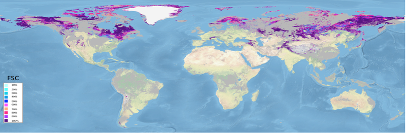Figure 1: Prototype of global fractional snow cover (FSC) product from Terra MODIS data from 18-22 March 2017 (generated by ENVEO, 2017).