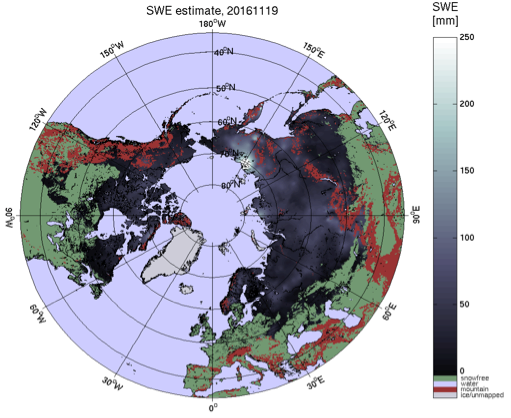 Figure 2: Demonstration product of snow water equivalent (SWE) on 19 November 2016 over the northern hemisphere from passive microwave data (generated by FMI, 2017).