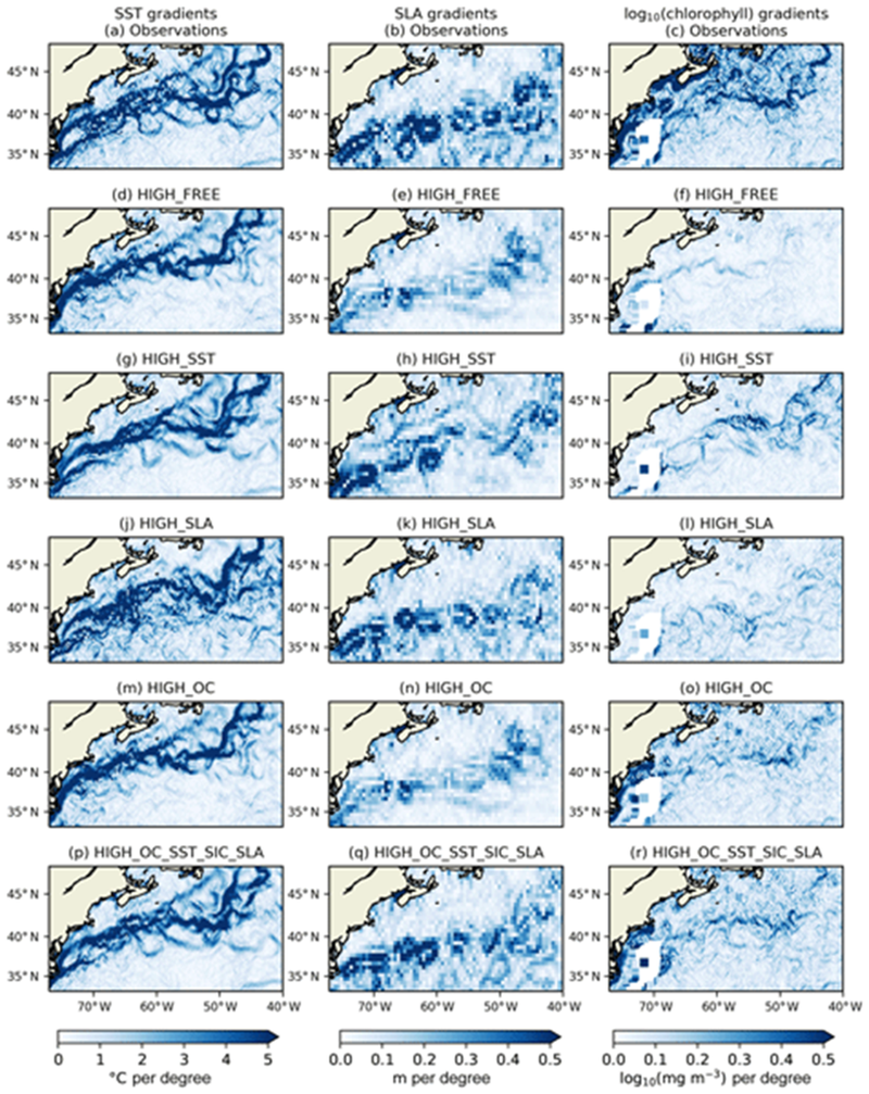 ESA CCI ECV products have been assimilated into a global physical–biogeochemical ocean model to create a set of 13-year reanalyses at 1° resolution and 3-year reanalyses at 1∕4° resolution. The variables were assimilated individually and in combination. The satellite products were found to be consistent in their representation of spatial features such as fronts, sea ice extent, and bloom activity (Figure 1). Phytoplankton biomass correlated more strongly with net air–sea heat fluxes in the reanalyses than chlorophyll concentration did, and the correlation was weakened by assimilating ocean colour data, suggesting that studies of phytoplankton bloom initiation based solely on chlorophyll data may not provide a full understanding of the underlying processes.
