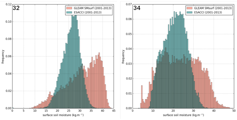 According to the figure, there are some differences between the two products. The histogram of GLEAM data present a wider range of soil moisture values compared to the one of the CCI data. This is particularly true in dry context, i.e. during the dry season (boreal summer) and semi-arid regions. Thus we have to be careful when we validate climate models and we try to find a better method of validation.